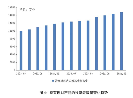 截至2026年一季度末,全市场持有理财产品的投资者数量达1.48亿个,同比增长17.46%。比2025年年末1.43亿个增长500万。理财投资者队伍持续壮大。