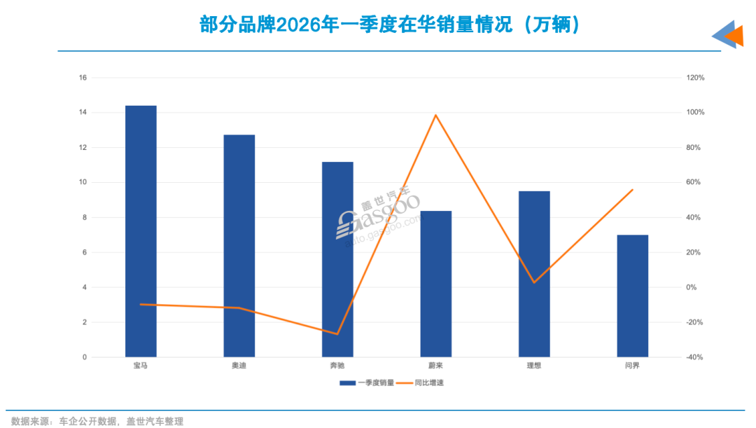 本土高端新能源品牌的增长曲线变得喜人。蔚来一季度交付8.35万辆,同比暴涨98.3%;理想交付9.51万辆;问界卖了7万辆,同比增长55.6%。上述车企增长主要集中在中大型及以上SUV市场——正是BBA的传统腹地。
